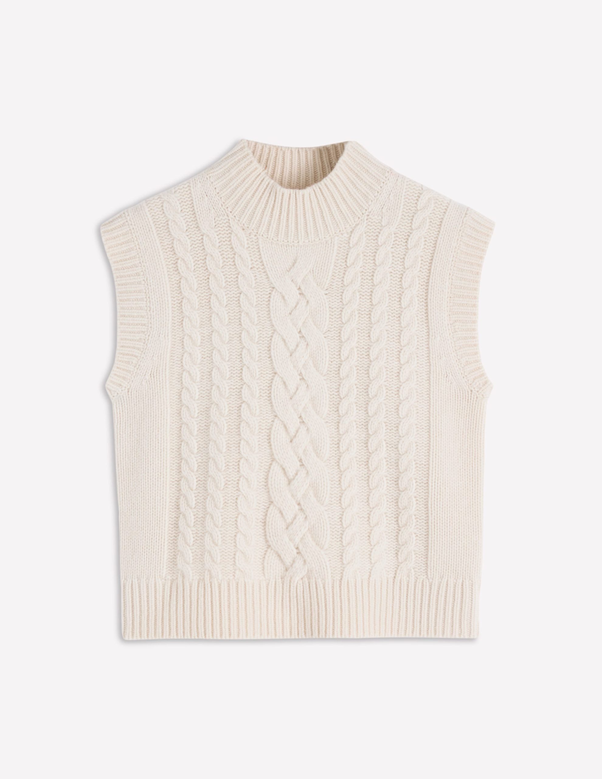 Made from 100% wool with a stand-up neck. this versatile chunky cable knit tank will be your go-to winter layer.