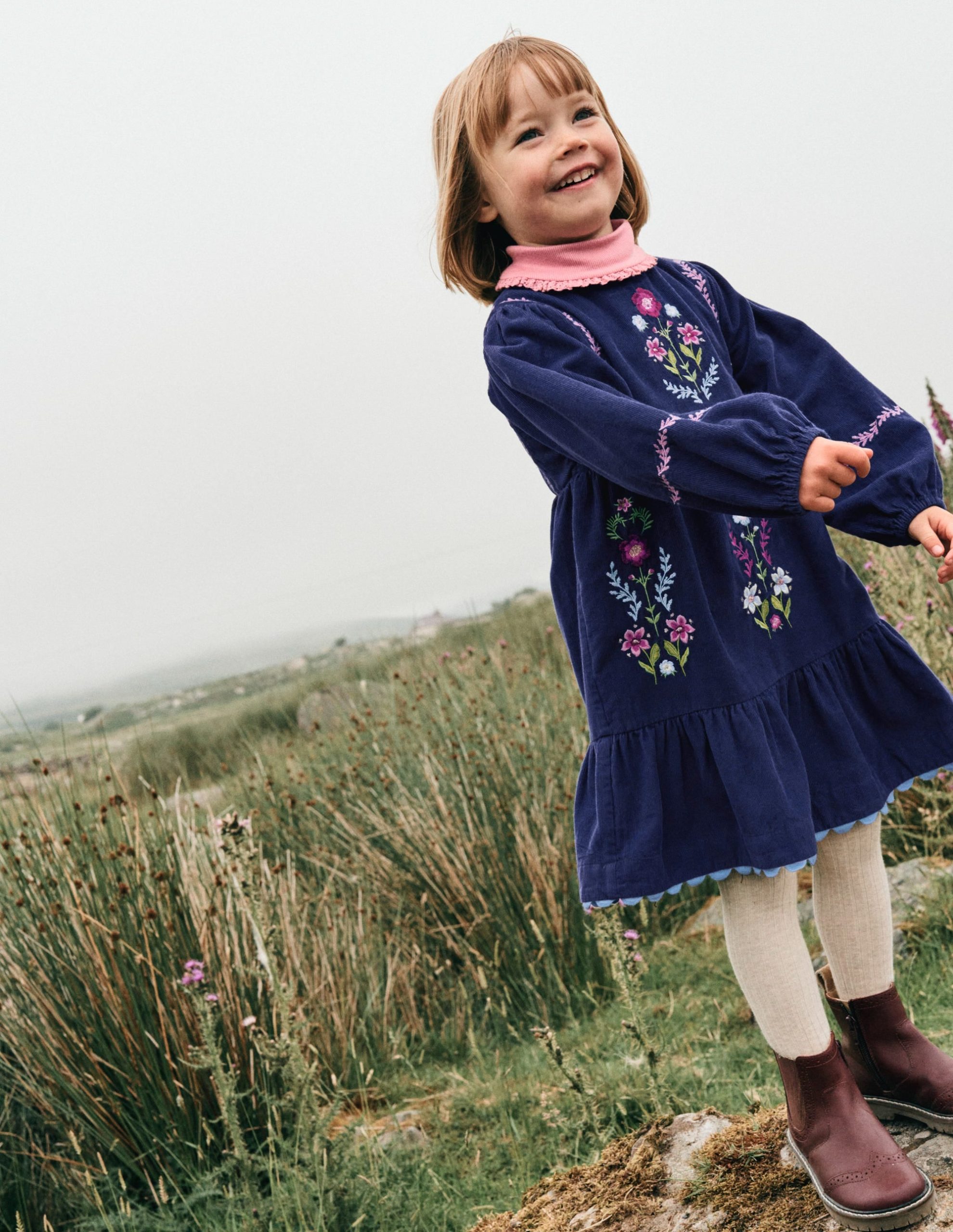 If you’re looking for a dress to treasure for years (and generations) to come. this adorable cord style is the one. It has a sparkly embroidered design. blouson sleeves and gentle gathers finished with ric rac trim.