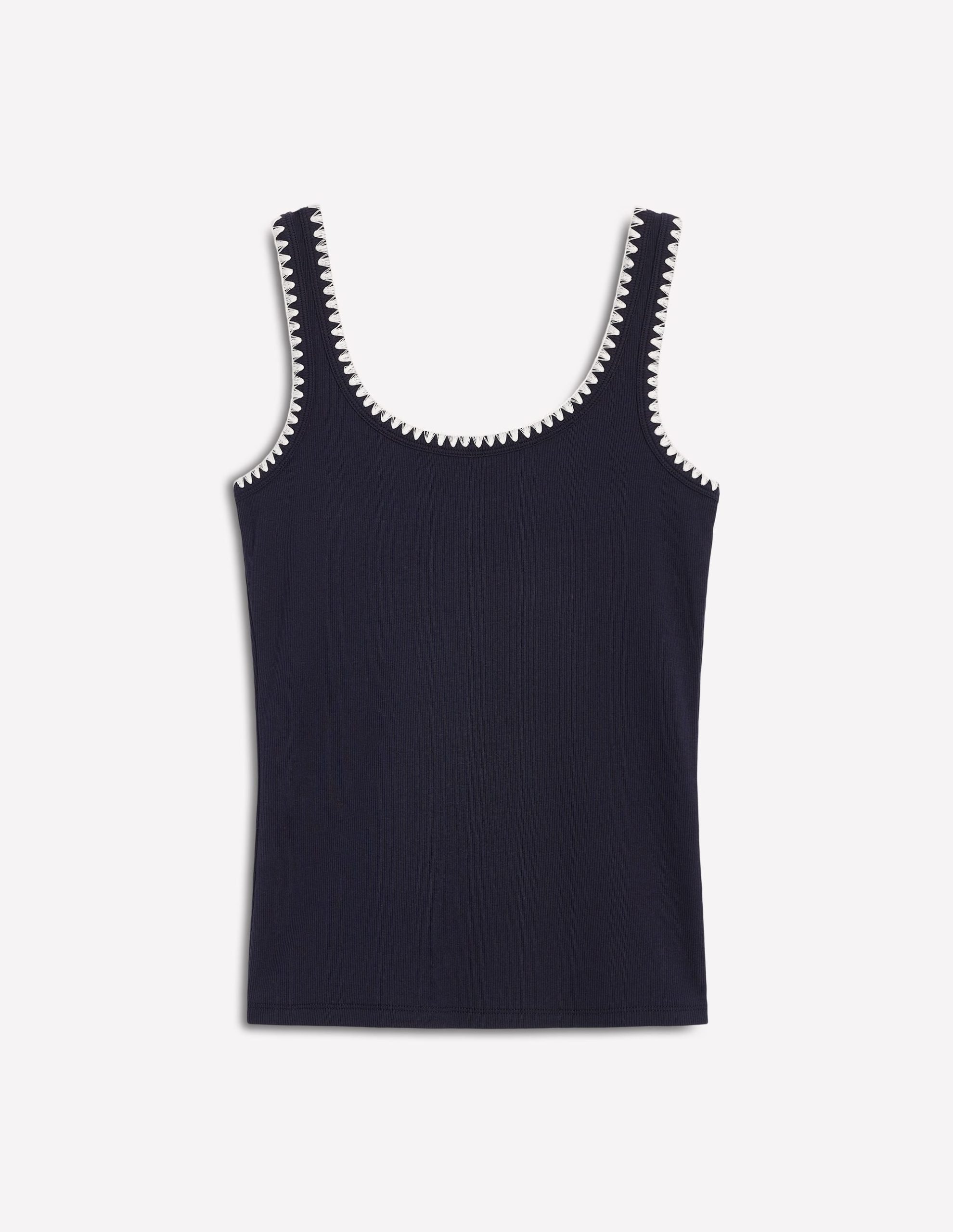 This flattering scoop neck vest with contrast crochet trim will be a main player in your summer wardrobe. It’s spun in cotton with a little stretch for bulk-free layering on cooler days.