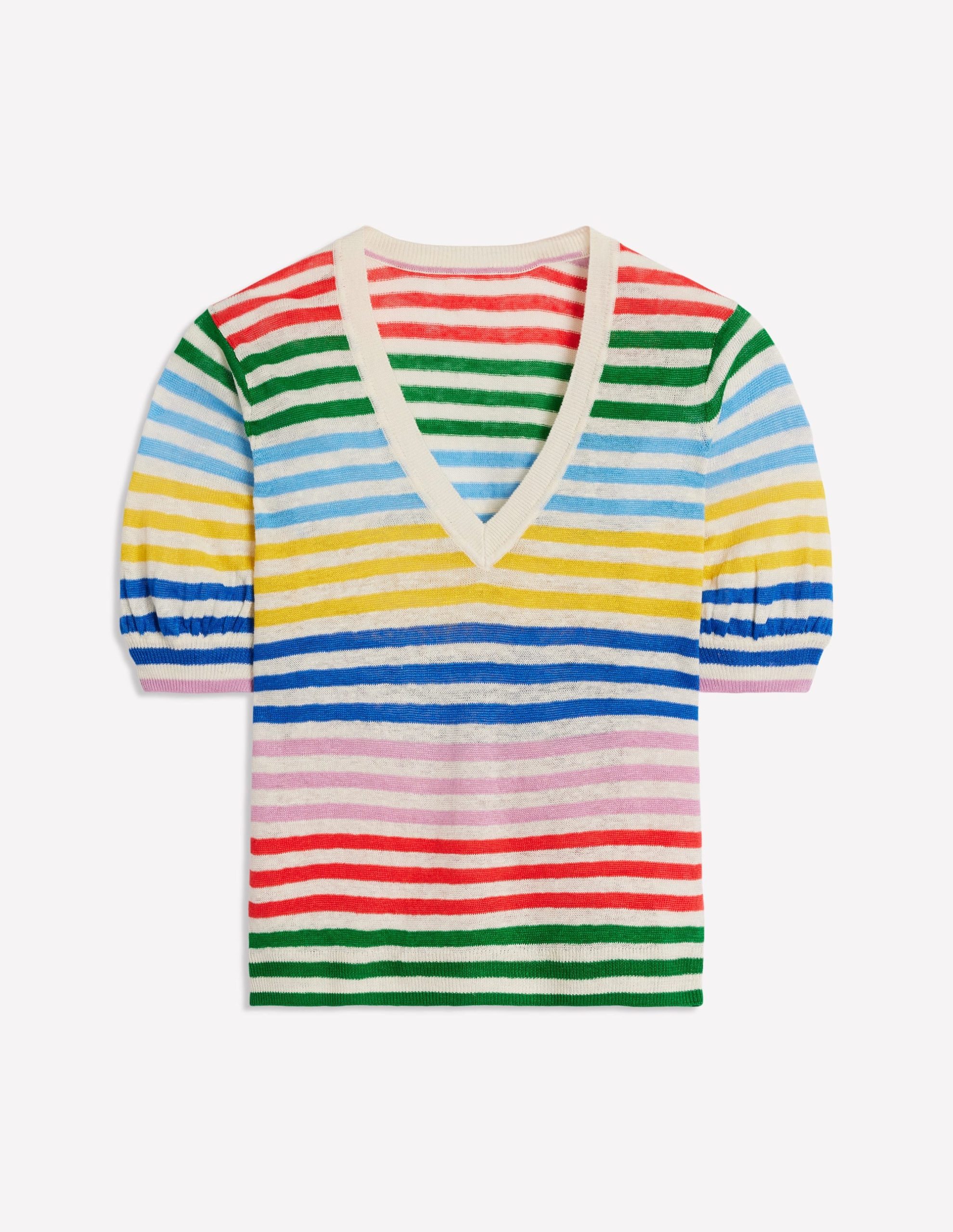 Liv V-Neck Linen T-Shirt-Banded Rainbow Stripe