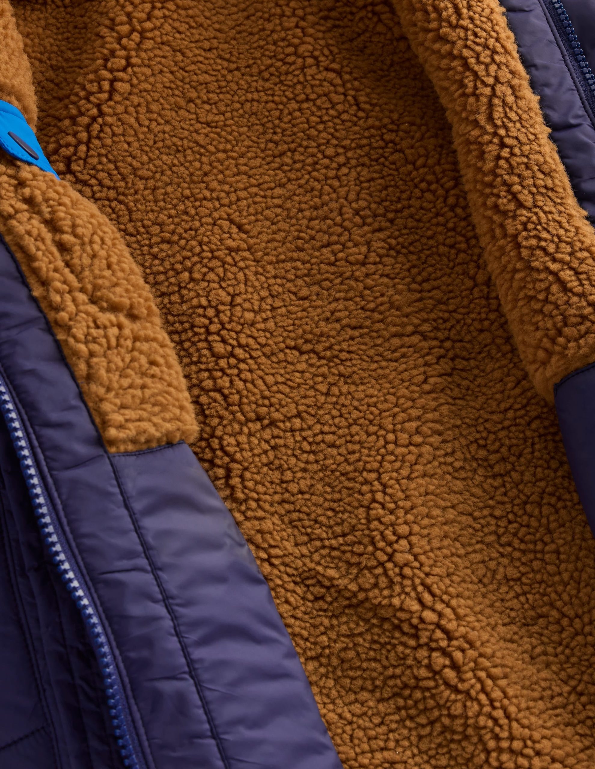 A reversible hooded jacket ready for climbing. jumping and exploring. no matter what the weather brings. Minis can switch between a colour-blocked print or cosy borg ?C both have handy pockets and attract big hugs.