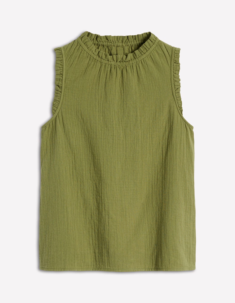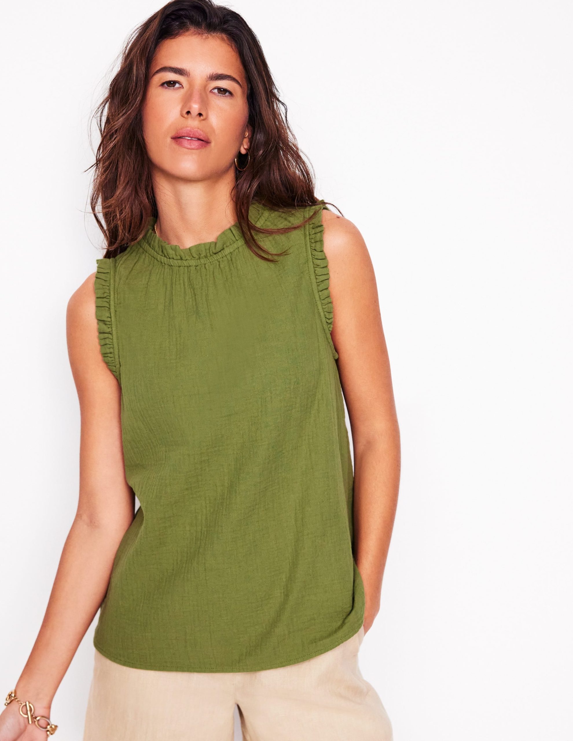 Our Sophie top is floaty and spun from cool. breathable cotton. We’ve added ruffles at the shoulders and neck. too.