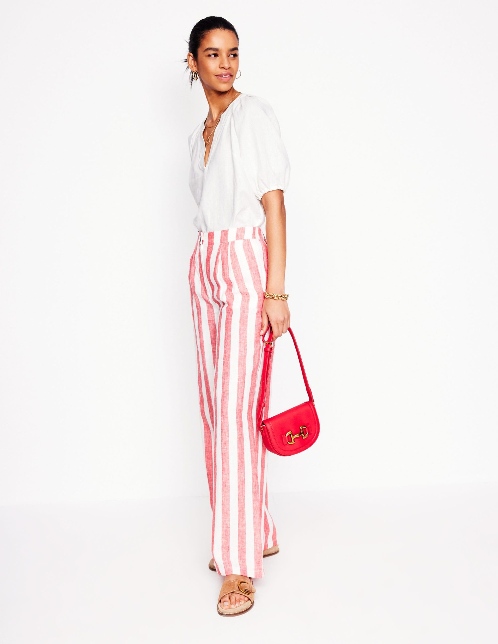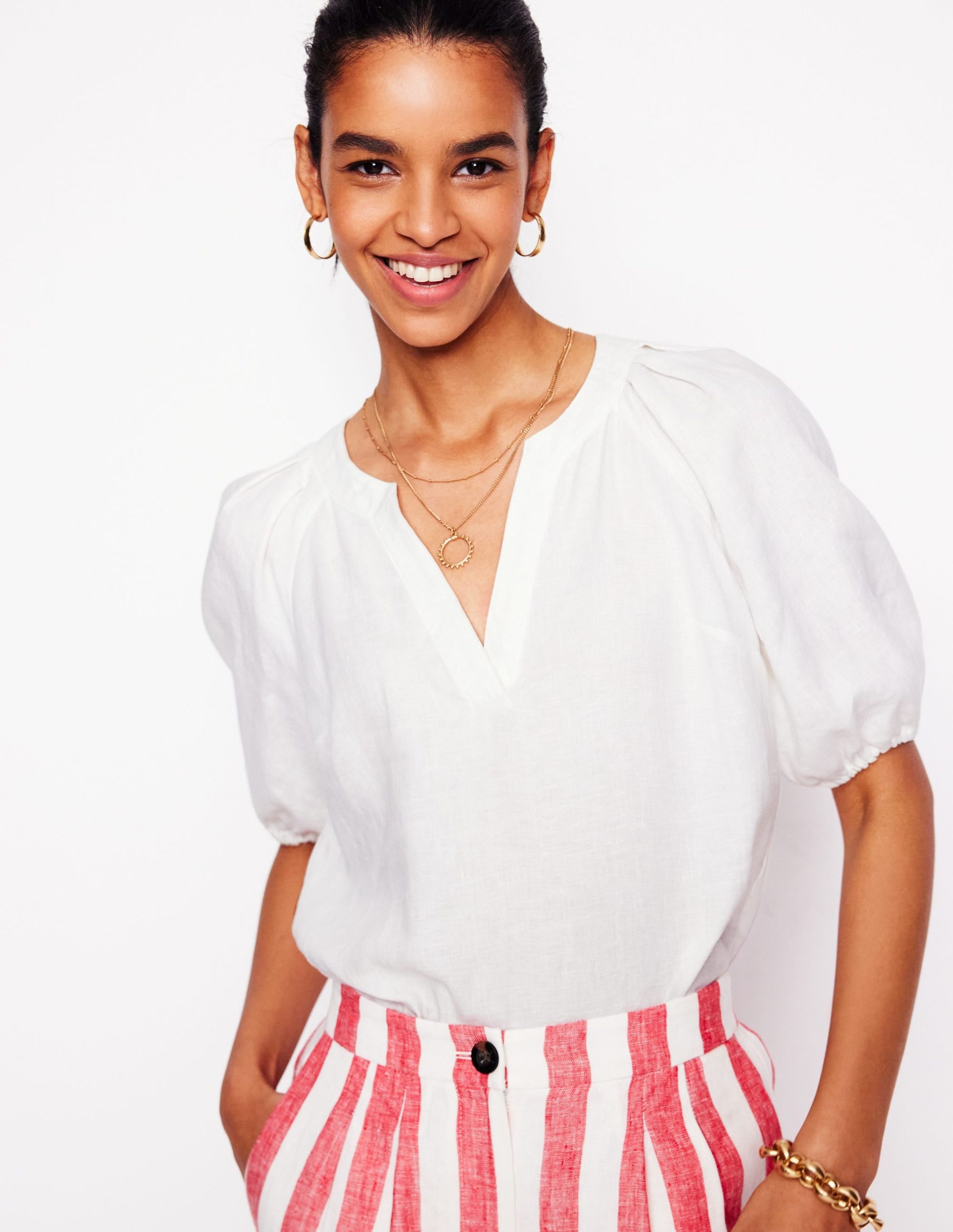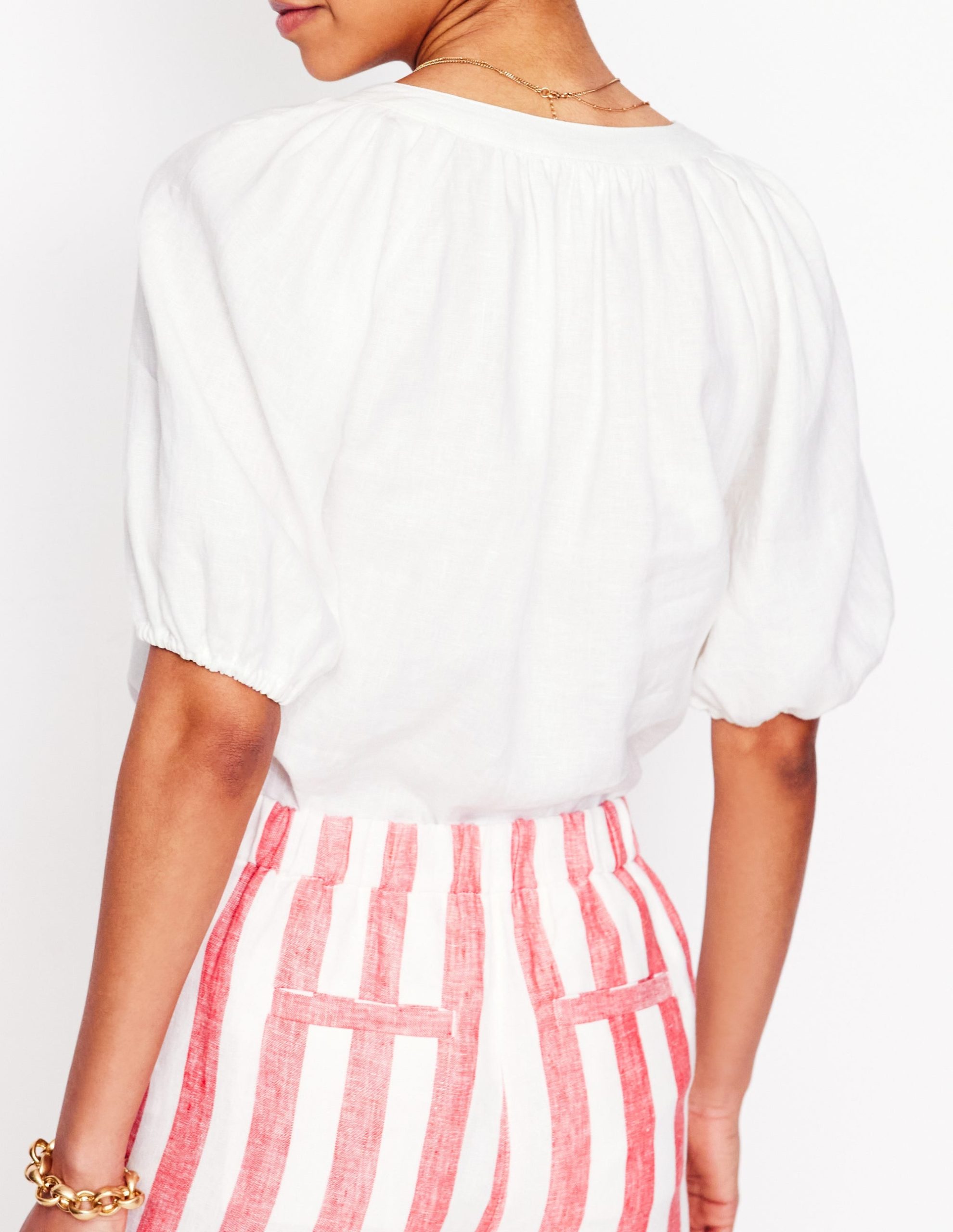 A pure linen top that deserves plenty of airtime this summer. The flouncy sleeves. flattering V-neck and soft gathering makes it the ideal addition to a relaxed weekend look.