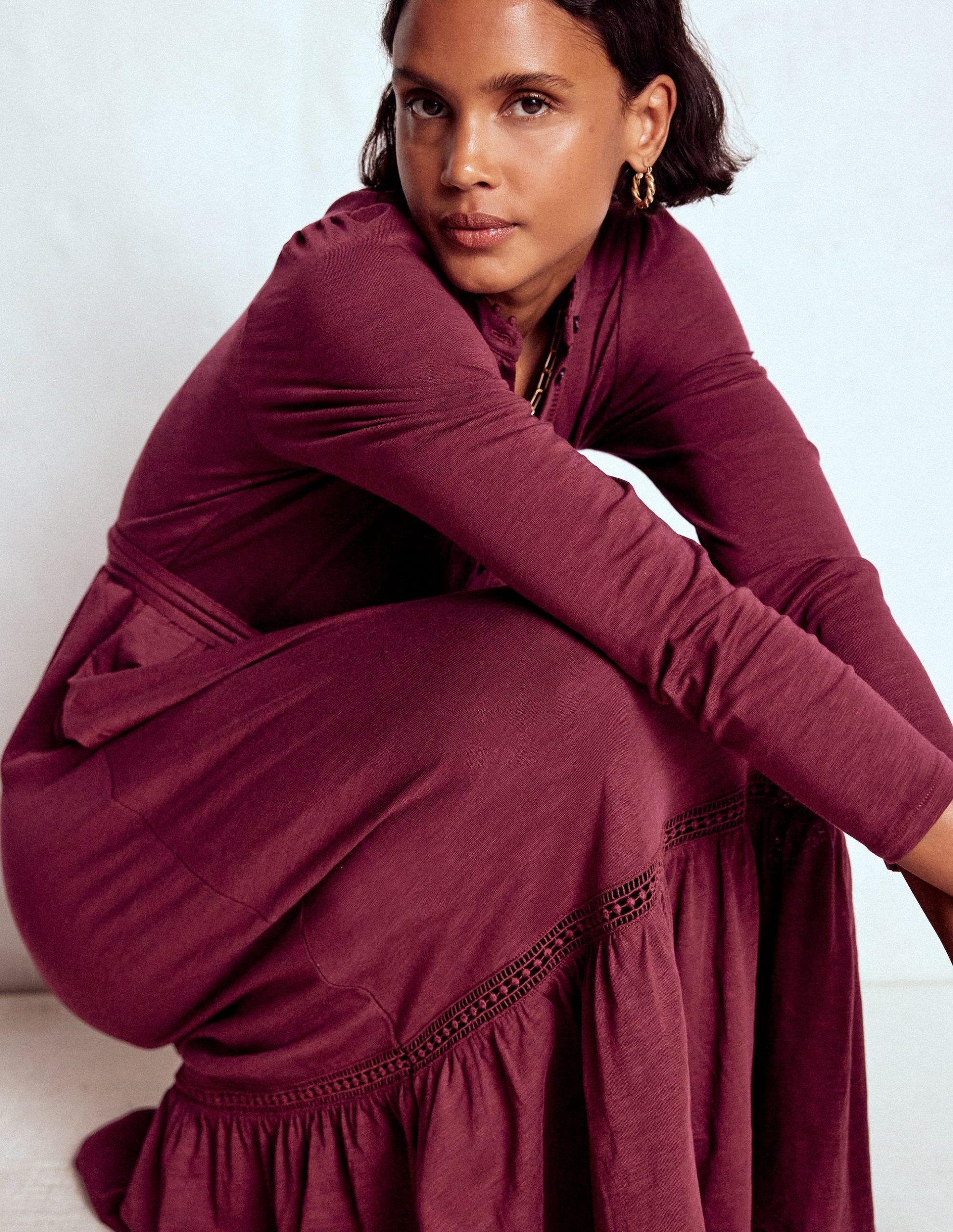 A shirt dress is always a good idea. This one has a semi-fitted top pulled in with a fabric belt and a tiered. gathered skirt. Adding some lace detail? That’s an even better idea.