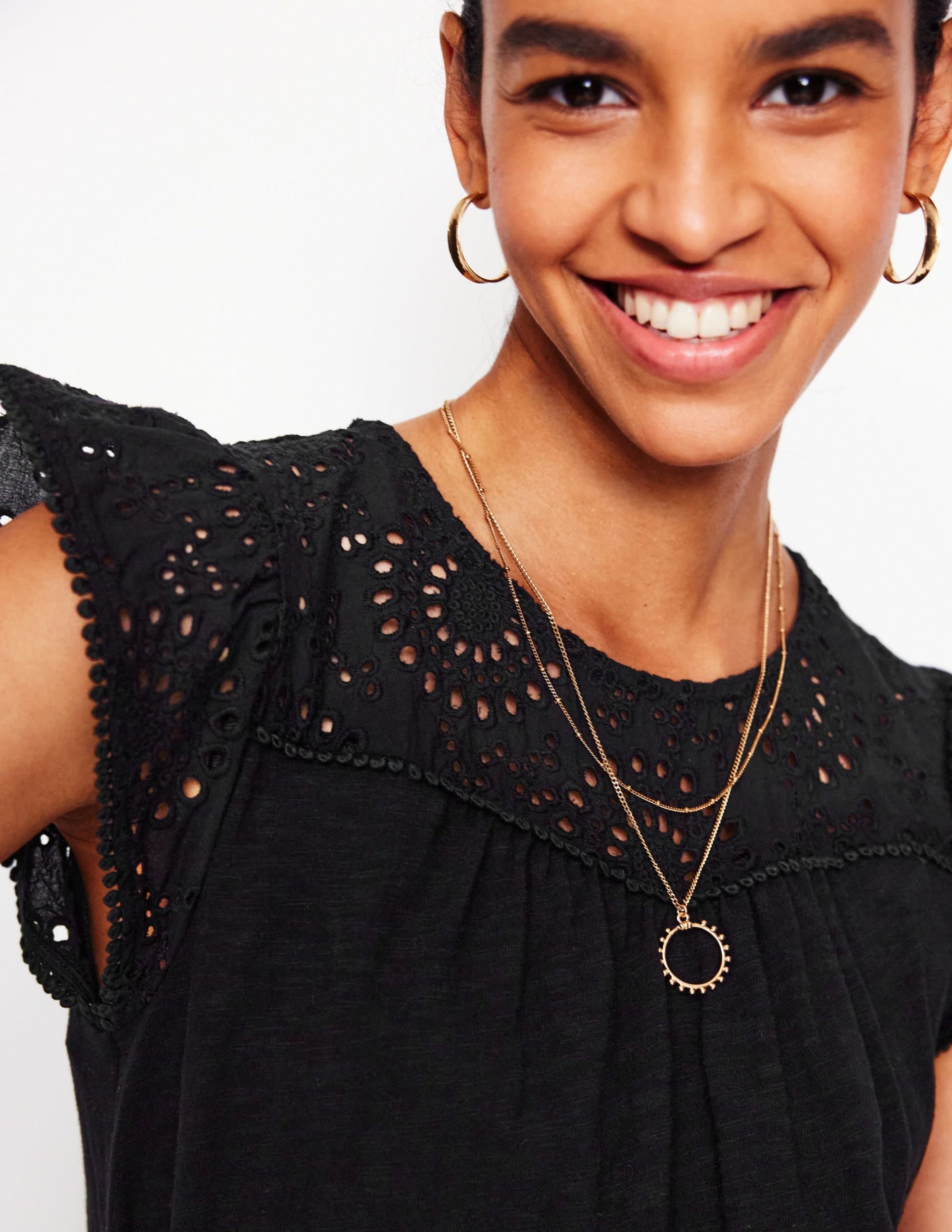 Our short Juliet style is a classic summer must-have. The flutter sleeves and pretty woven broderie will put a smile on your face. The look is all tied up with a neat tie waist belt and your favourite flats.