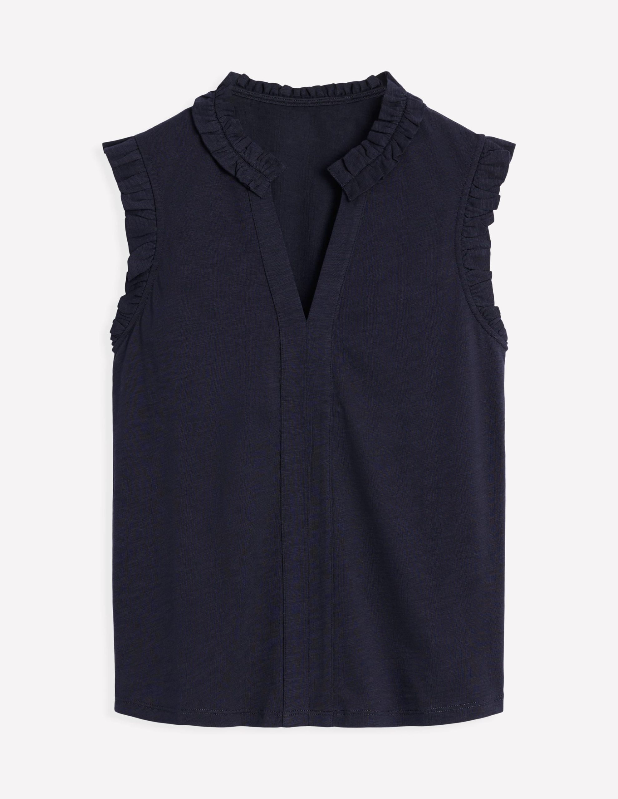 Ah. summer. It’s time to get out the sleeveless tops and enjoy some sunshine. We’ve crafted Lola from a cotton blend and given it a comfortably cool flowy shape with frilled shoulders to act as cap sleeves.