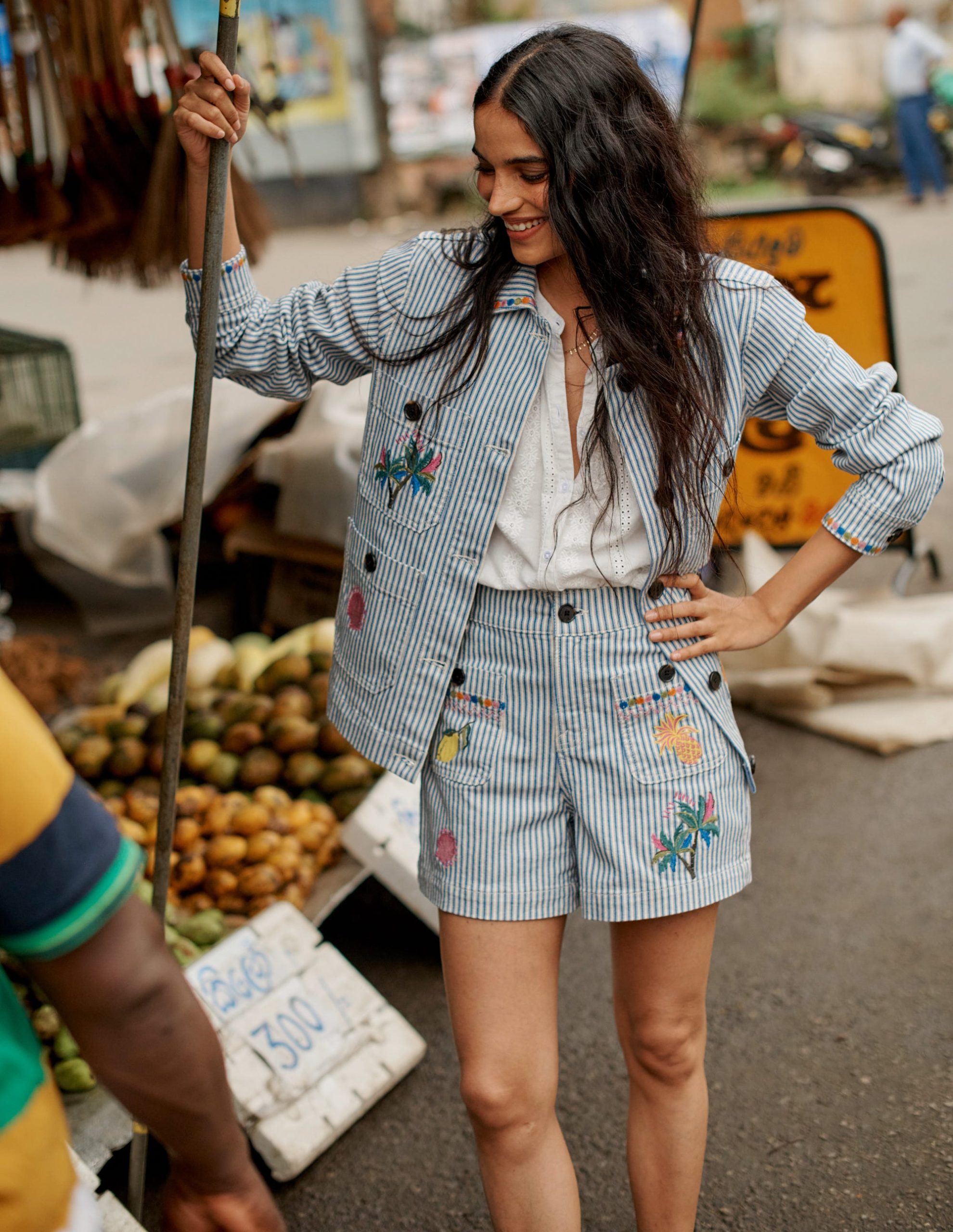 Pocket Front Denim Shorts-Ticking Stripe Embroidery