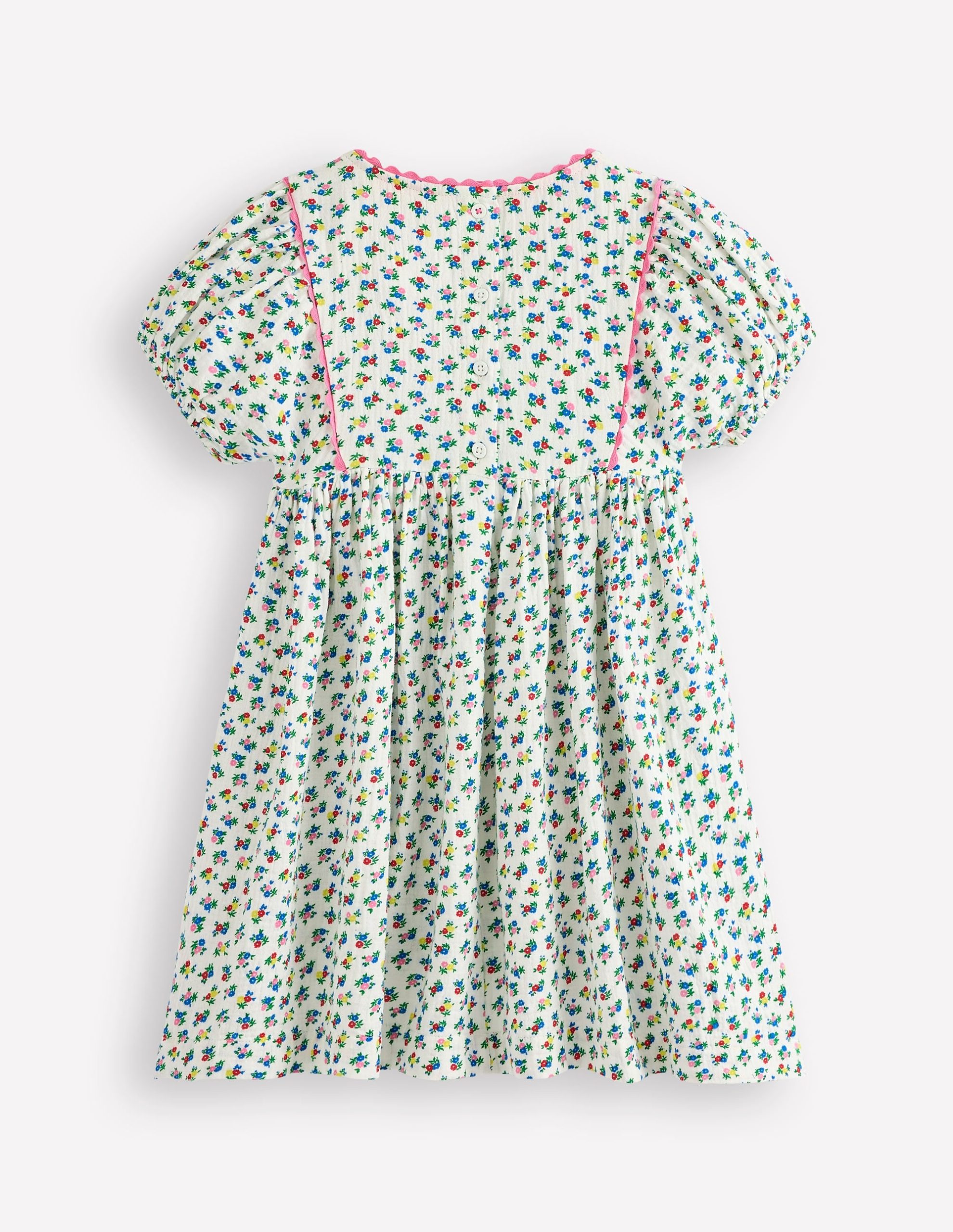 There’s no sweeter thing than Minis in puff sleeves and a full swishy skirt on a sunny day. We know you love detail. so we added a colourful ric rac trim and buttons on the back.