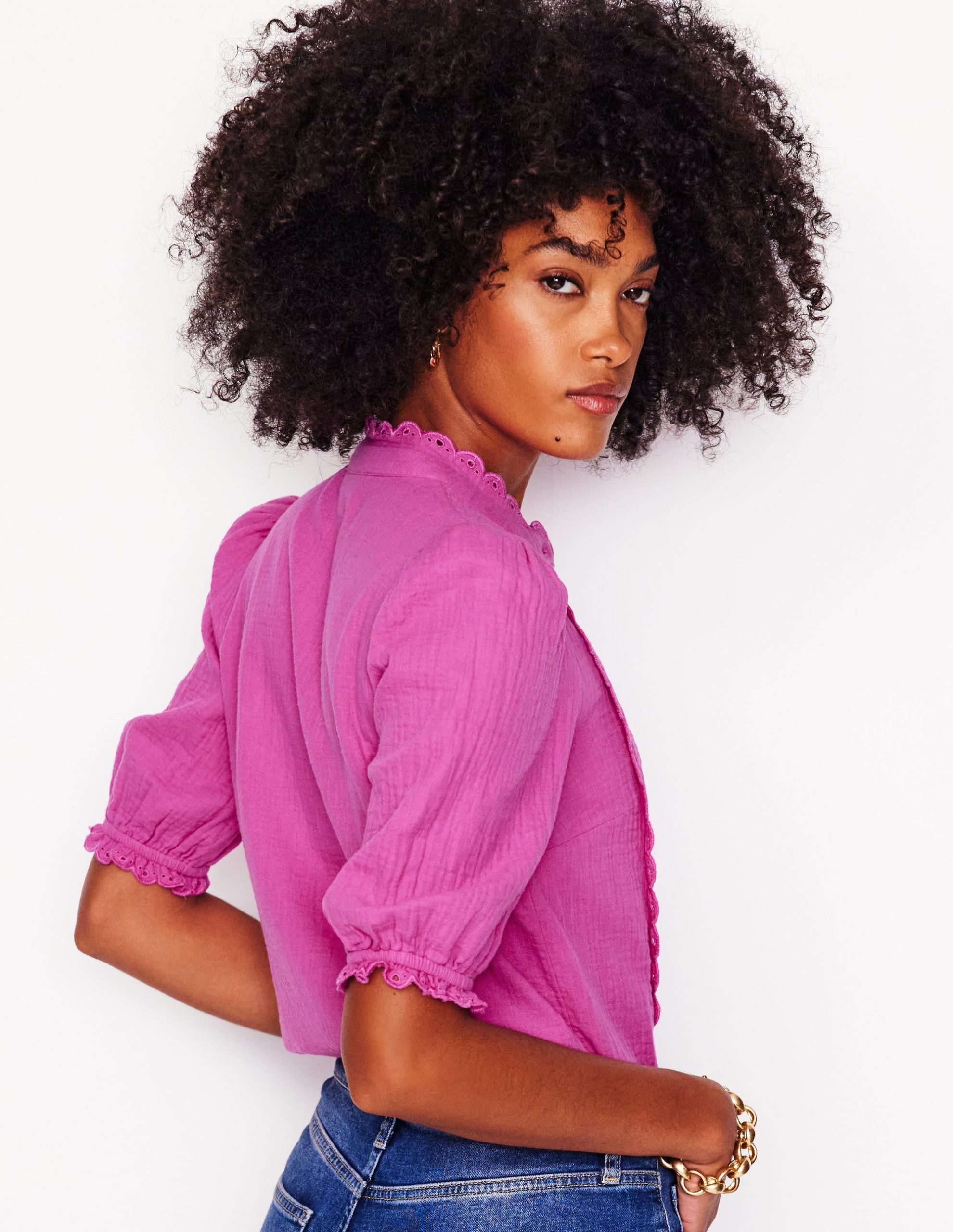Decorated with scalloped trims in abundance. this relaxed-fitting double cloth blouse is a modern take on romantic styles.