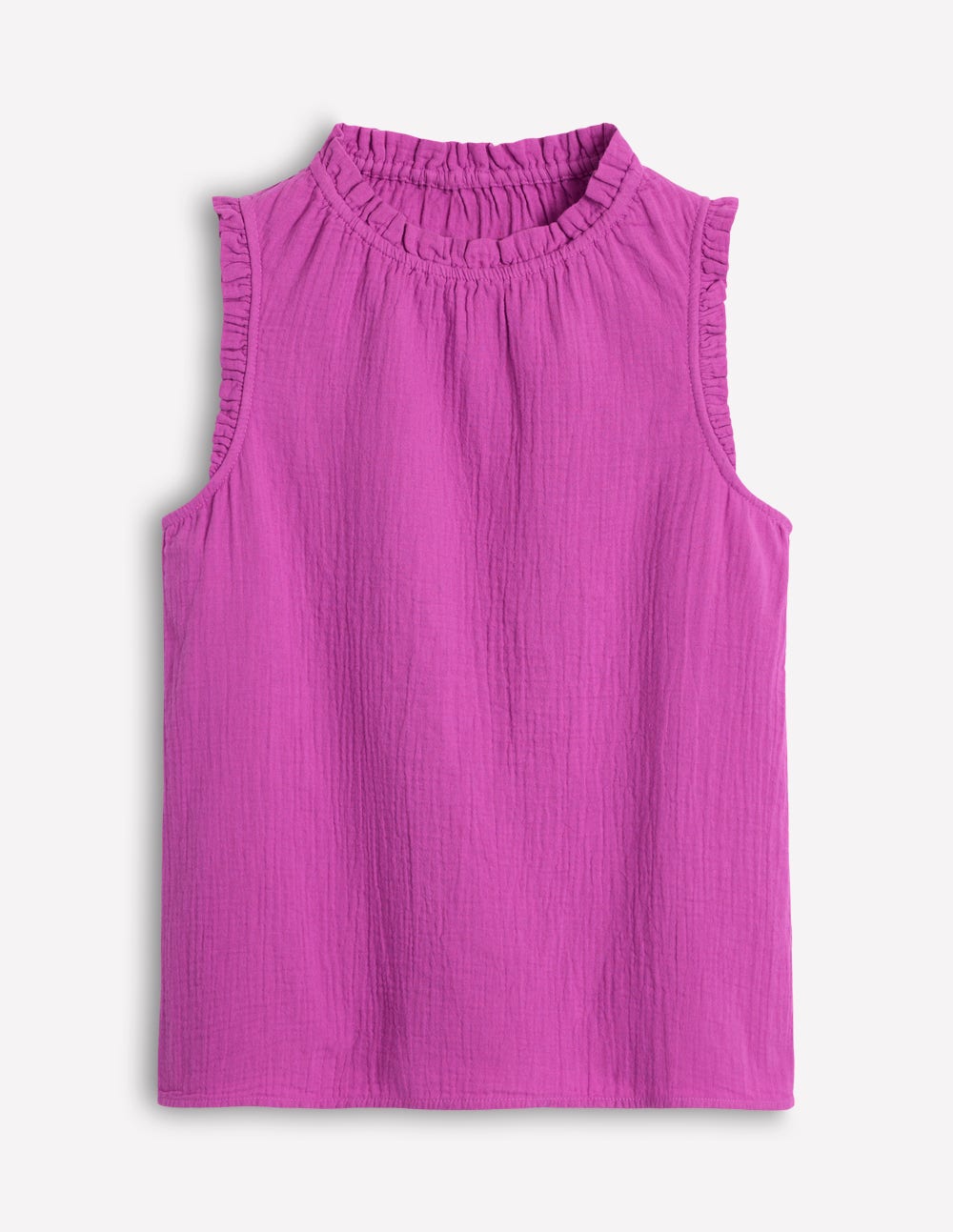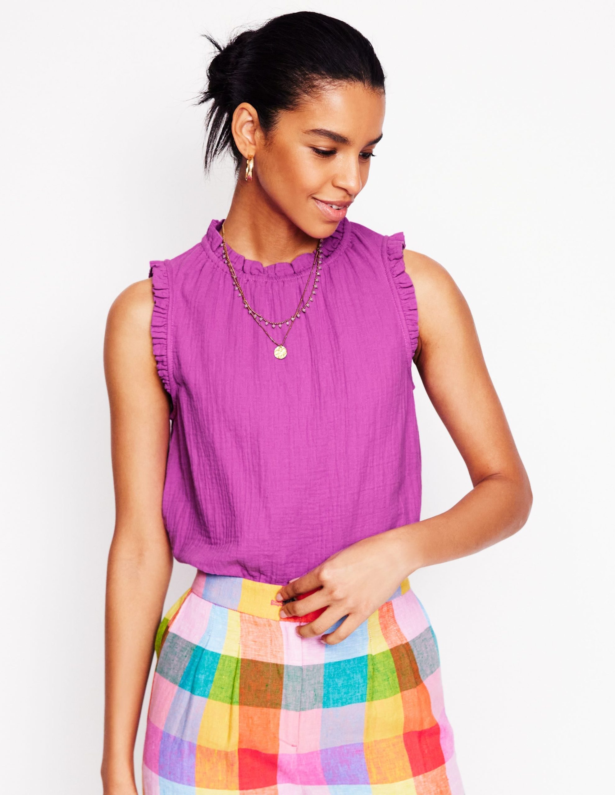 Our Sophie top is floaty and spun from cool. breathable cotton. We’ve added ruffles at the shoulders and neck. too.