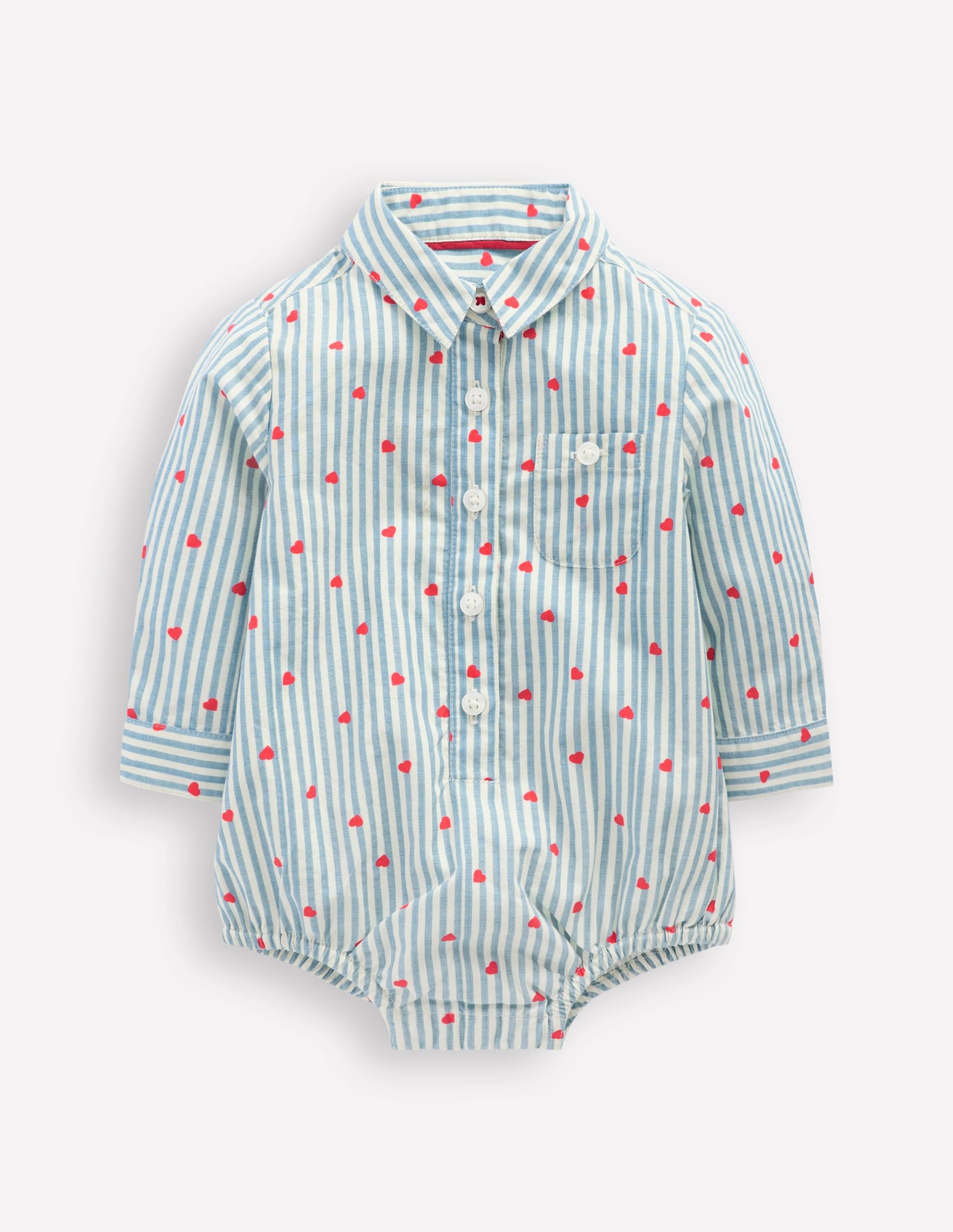 Does an occasion call for something a bit special? We’ve reimagined the classic body (still supersoft and with poppers for easy changing) into this shirt body. Confetti hearts and stripes. plus a collar with button placket make this one stand out.